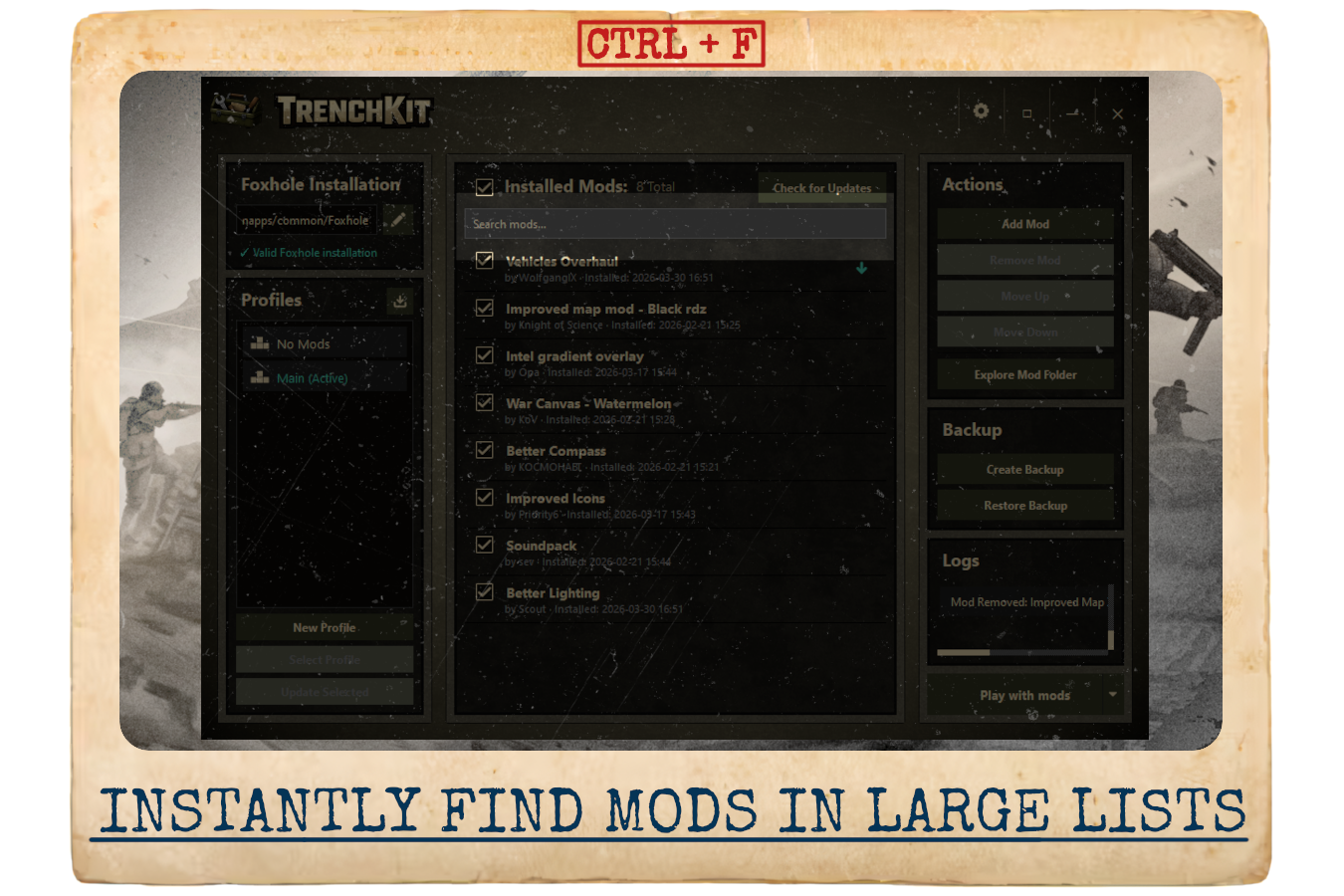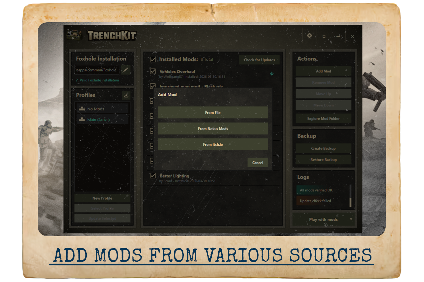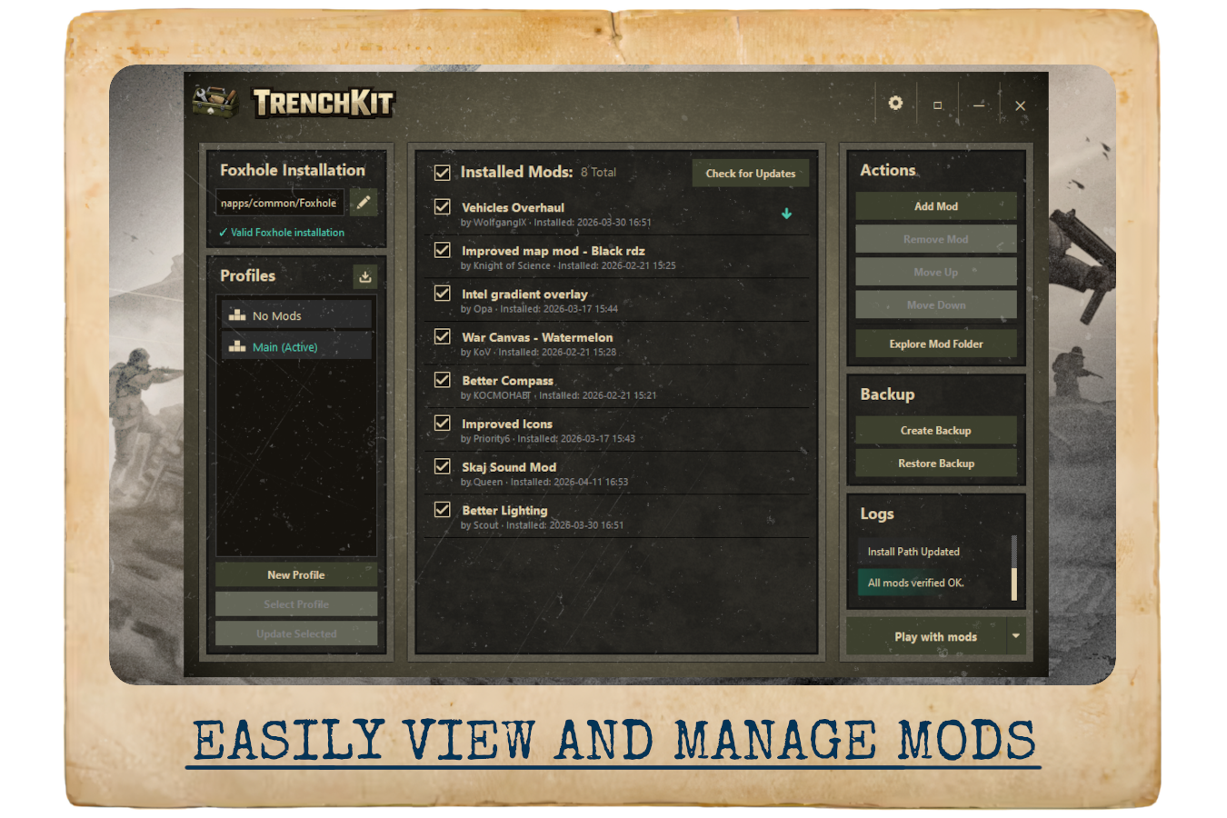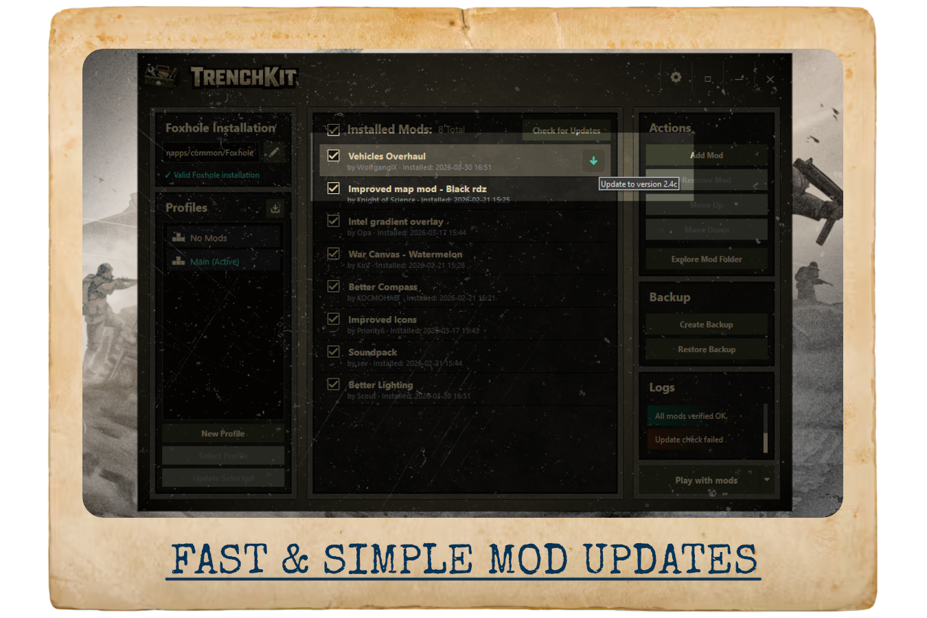 Foxhole modding has often meant a lot of manual setup: finding the right file, checking for newer versions, replacing older files, and hoping nothing conflicts.